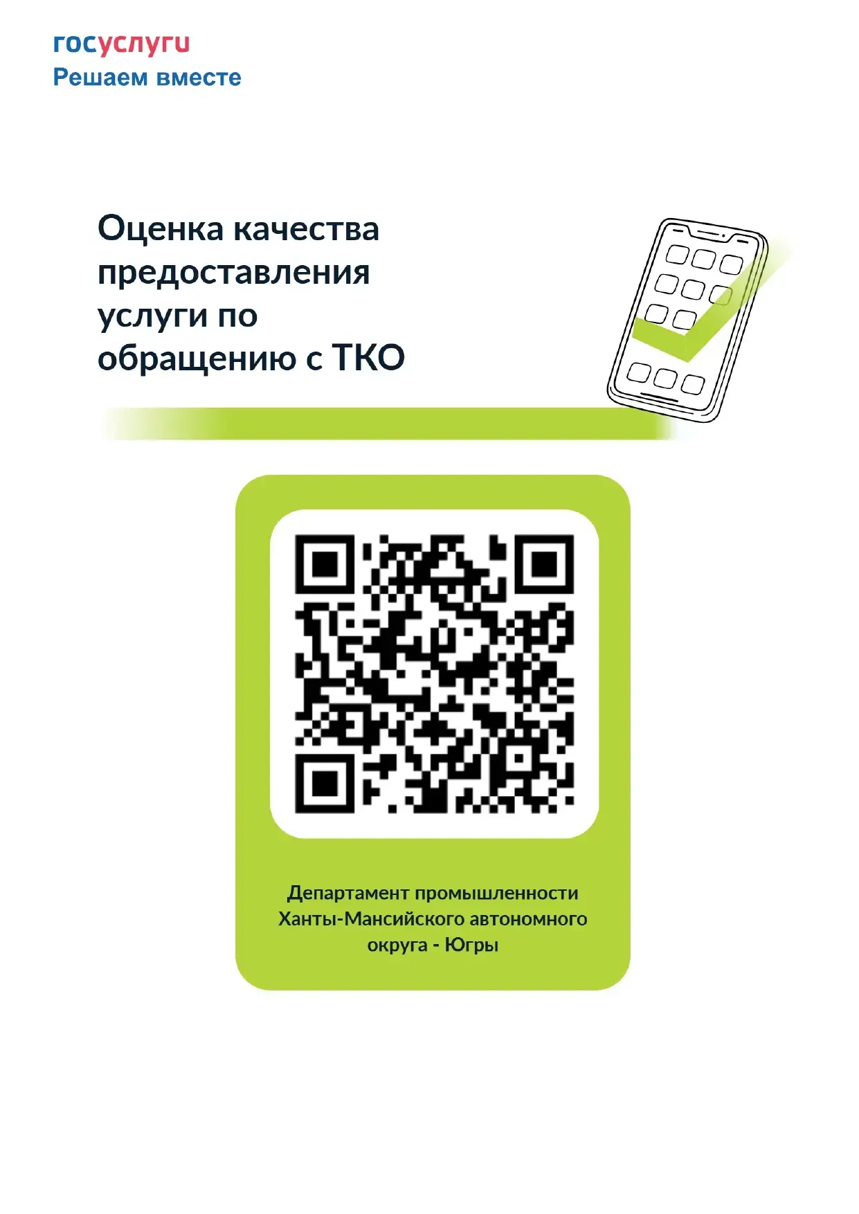 Департамент промышленности ХМАО — Югры сообщает о запуске опроса жителей на тему: «Оценка качества предоставления услуг по обращению с ТКО». Приглашаем всех принять участие в опросе на платформе «Госуслуги.Решаем вместе».